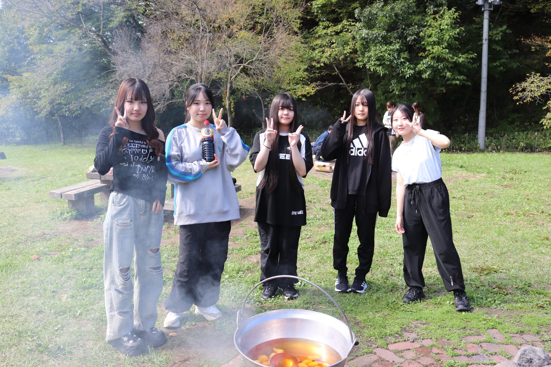 大きな鍋の中で、具材とだしが煮立ち、しょうゆの香ばしい匂いが食欲をそそりました。煮ている間も、交代で鍋をかき混ぜたり、焦げつかないように見守ったりと、協力しながらおいしい芋煮を仕上げていきました。
