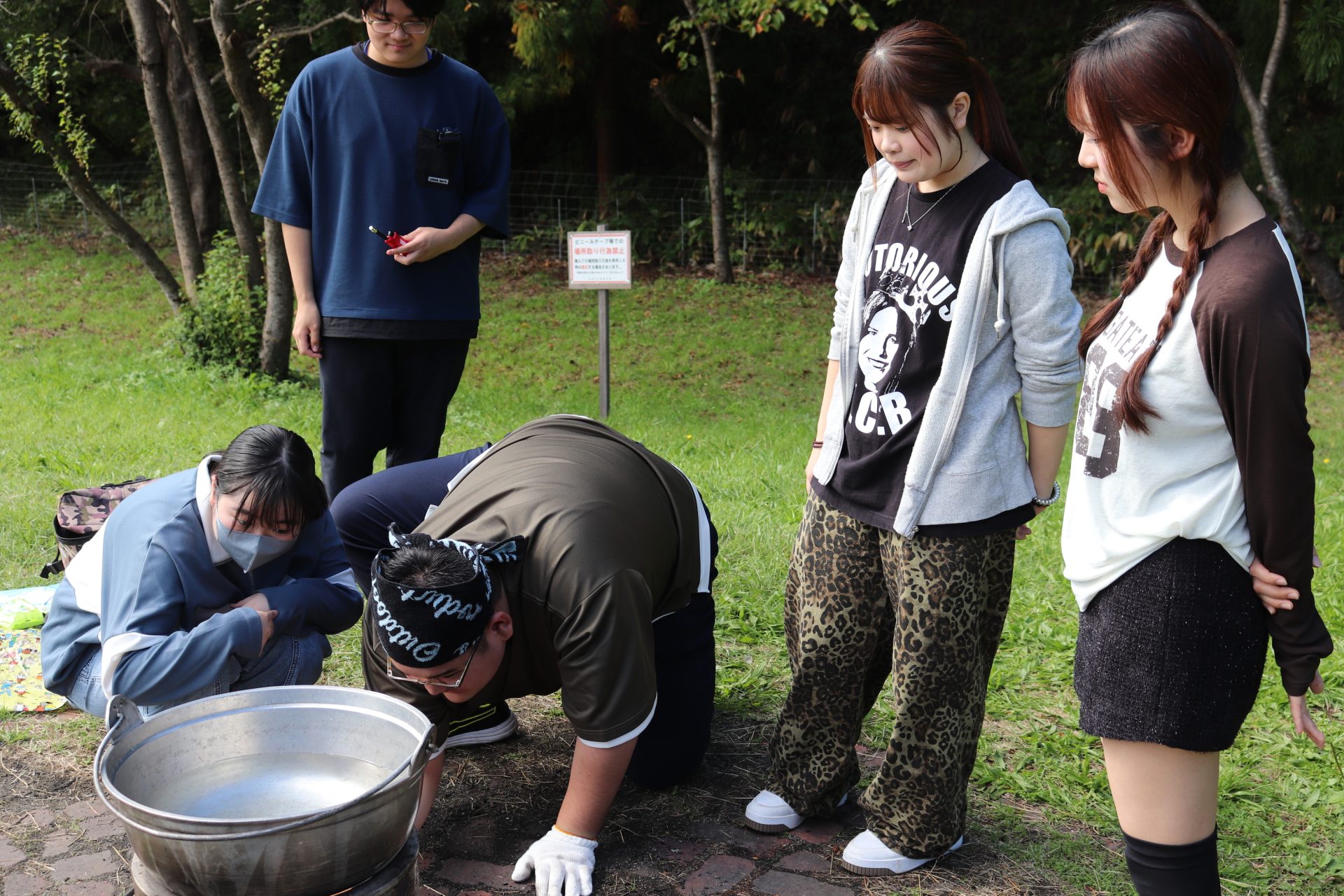 なかなか薪に火がつかず悪戦苦闘している班もありましたが、新聞紙や着火剤を使って慎重に火をつけ、うまく燃え上がったときには歓声が上がりました。