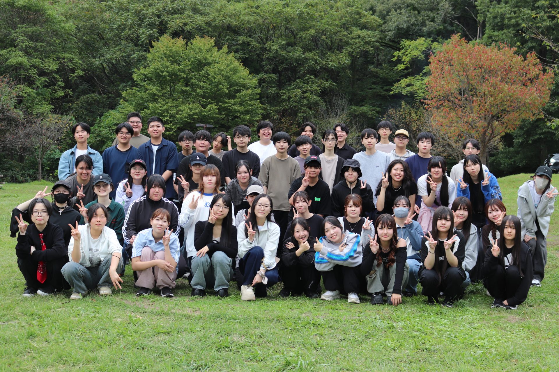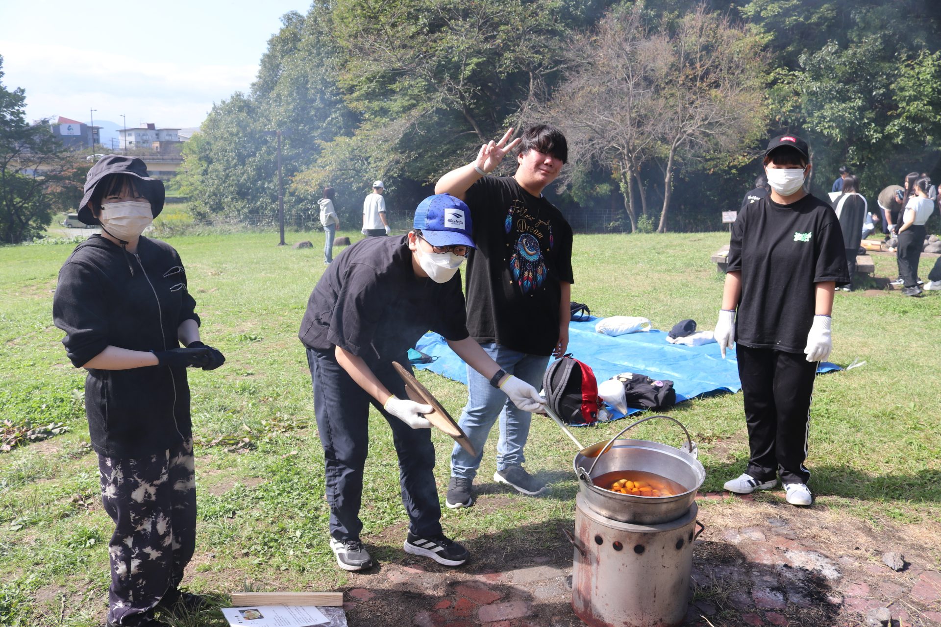 朝からさわやかな秋晴れの空が広がり、絶好の芋煮日和となりました。生徒たちは馬見ヶ崎川河川敷に集合後、班ごとに分かれて材料の準備をしたり火をおこしたりしました。